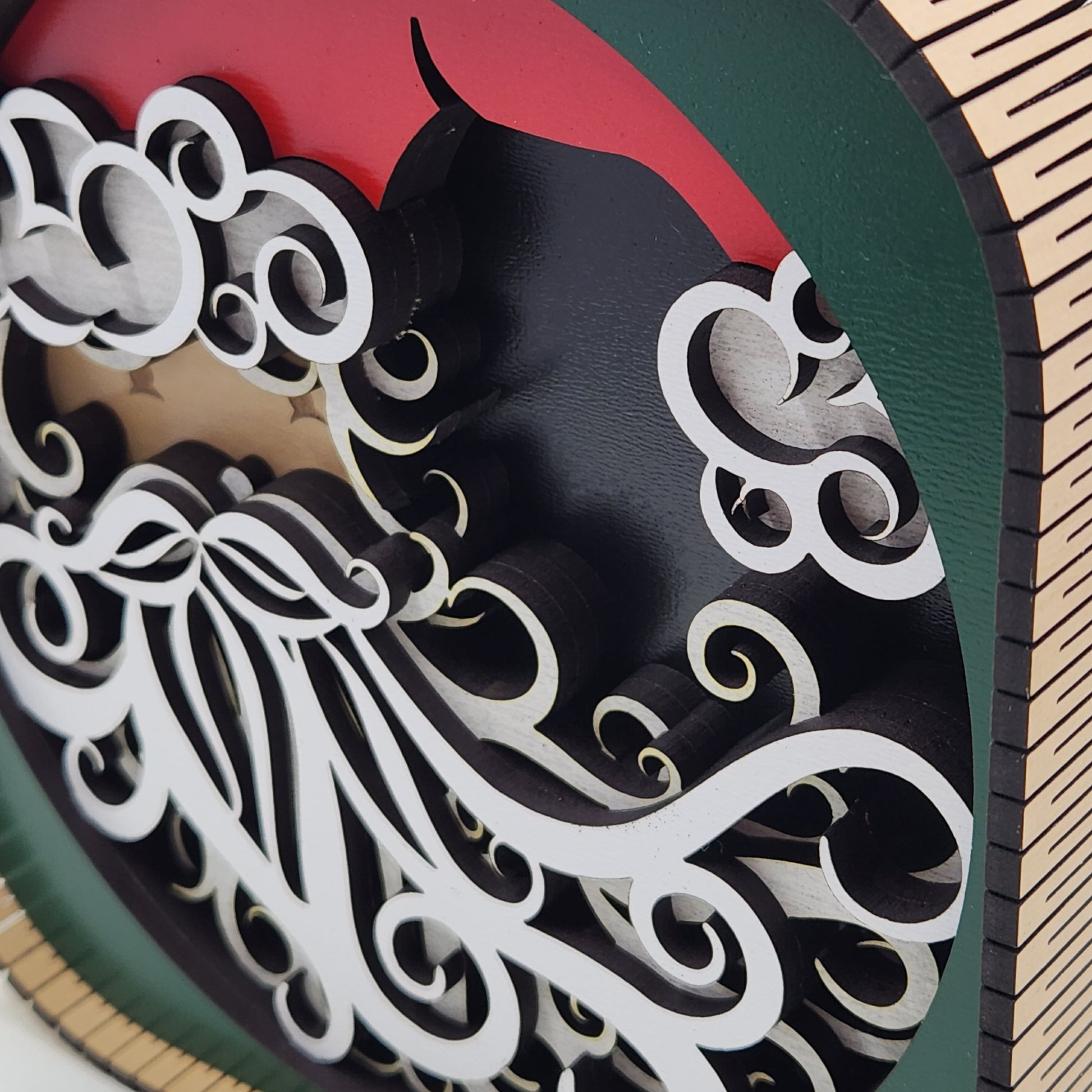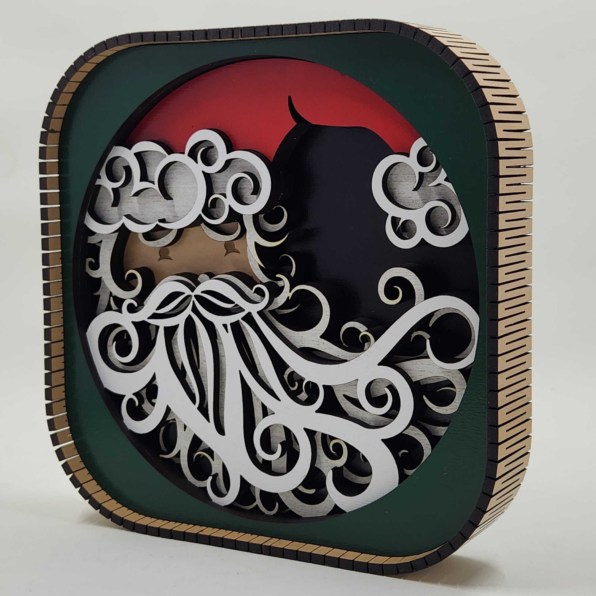 This precision-crafted Santa Shelf Sitter features six distinct layers and an integrated living hinge frame for professional finishing. Each piece measures 6" x 6" and serves as an exceptional display item for the holiday season. The dimensional construction creates depth while maintaining a compact footprint, ideal for desks, mantels, or shelving.