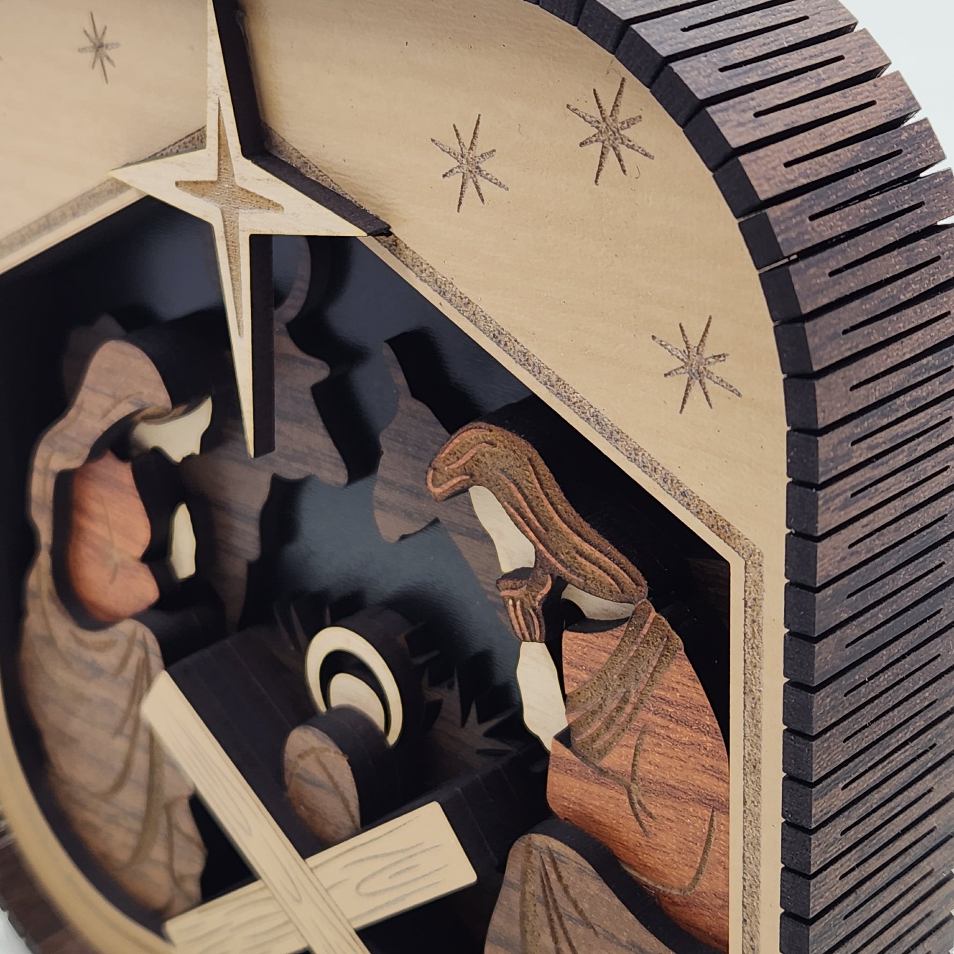 This precision-crafted Nativity Shelf Sitter features six distinct layers and an integrated living hinge frame for professional finishing. Each piece measures 6" x 6" and serves as an exceptional display item for the holiday season. The dimensional construction creates depth while maintaining a compact footprint, ideal for desks, mantels, or shelving.